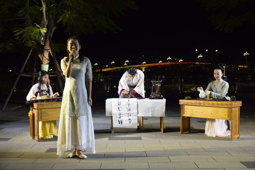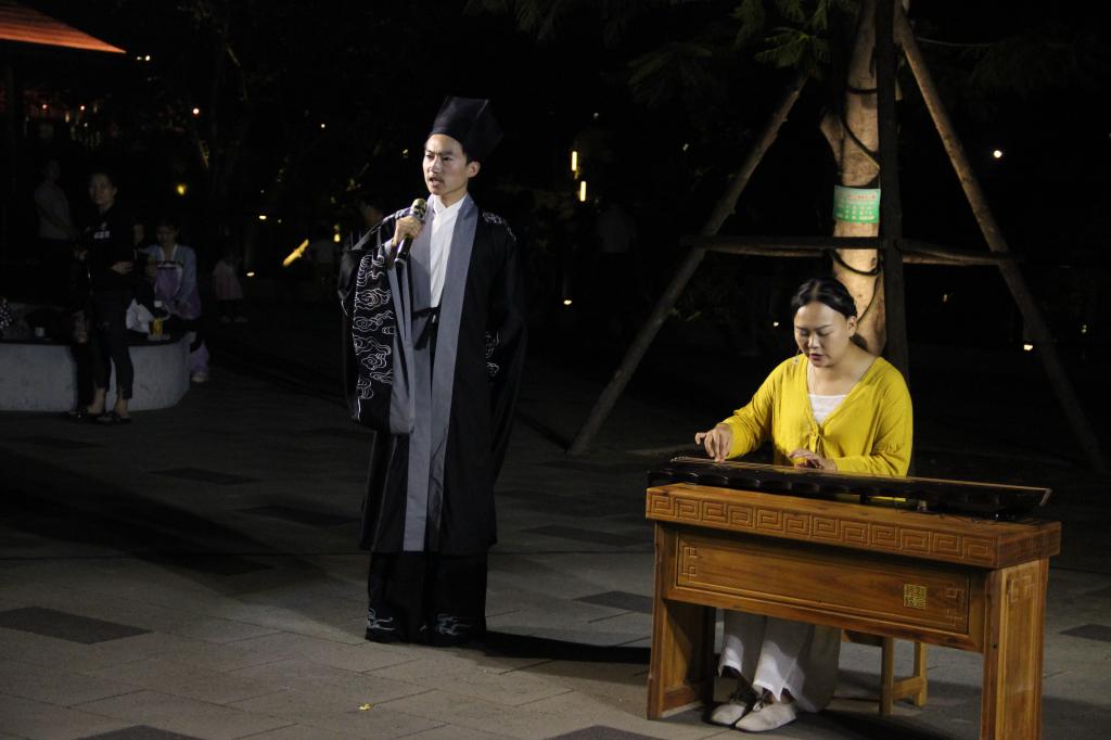 10月1日晚七点半,琴会雅集系列活动再续前章。玉指冰弦,宫商传意,在此次以“琴与歌”为主题的晚会中,泠泠琴音伴曼妙歌声远行,或婉转连绵、或荡气回肠。《酒狂》《叹香菱》《求索》《关雎》《归去来辞》《洞庭秋思》……相续登场,琴曲相生,琴声的抑扬顿挫,歌声的细致婉转,透着中文学子的悠悠情思,巧妙地带动观众们的情绪。现场观众静坐湖边,聆听太古遗音,感受着南湖静夜的清凉与唯美。
