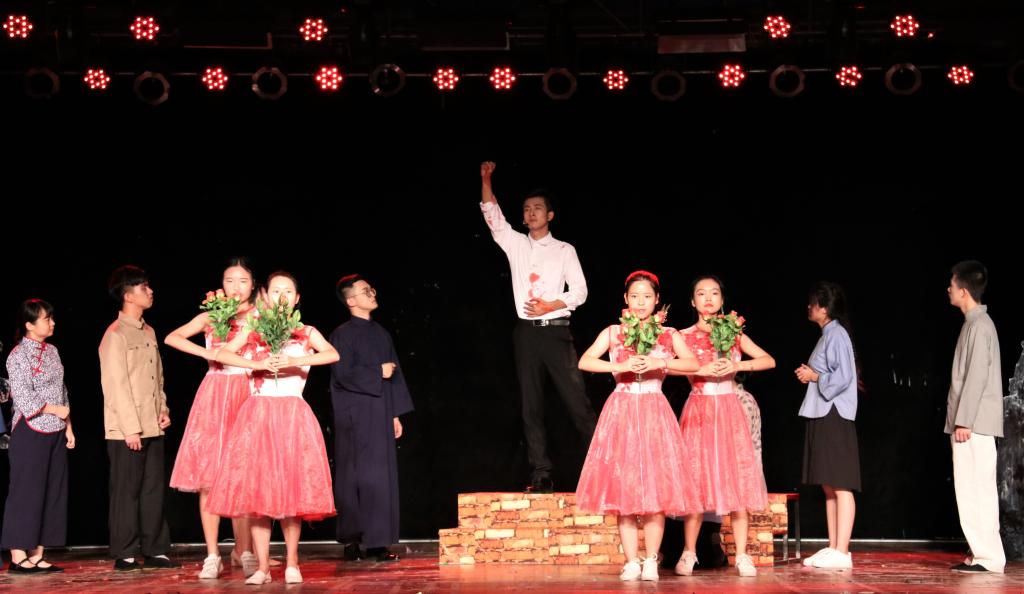 《芗潮》是邱煜焜老师依托漳州真实历史,于1984年改编创作的三幕抗战戏剧。它集中展现了上世纪三十年代中叶,日军进逼漳州,青年们在民族危亡的关键时刻做出的不同选择。该剧讽刺和批判了国民党当局消极抗日、以“攘外必先安内”为由头对共产党进行残酷镇压的罪恶行径。本场演出场面宏大,表演更是丝丝入扣,把柯联魁的英勇无畏和与敌人抗争到底的坚定信念表现得淋漓尽致,他坚毅勇敢,作为共产党宣传阵营中的骨干力量,积极宣传抗日救亡运动,成立芗潮剧社,却惨遭国民党特务杀害。即使被迫害,他也不忘作为共产党员的使命。整场演出扣人心弦,现场的师生观众也激情澎湃,深刻体会到“不忘初心,砥砺前行”的爱国精神。