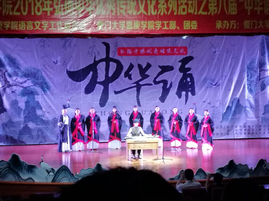 泠音琴社10名社员在古琴教师张艳辉和笛箫教师张为的带领下一同前往厦门大学嘉庚学院参与第八届“中华诵·经典诵读大赛”古琴演出。大赛由厦门大学嘉庚学院语言文字工作委员会、学工部、团委联合主办,人文与传播学院团委承办。龙人古琴研究院副院长、福建省古琴技艺传承人张锦冰受邀参加并参与古琴演奏。