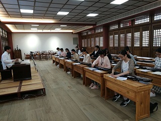 18日晨起,同学们在古琴研究院黄志禄老师、郑伊老师的指导下,巩固了古琴的八个基本指法,并学习了《求索》、《仙翁操》、《客至》、《蒹葭》四首琴曲。在老师的指导下,同学们对于曲中的散五如一、搯起等指法有了正确的认识。晚上同学们向老师请教白天所习的两首曲子,在耐心解答的同时老师还分享了他的学琴经验和看法,同学们受益良多。