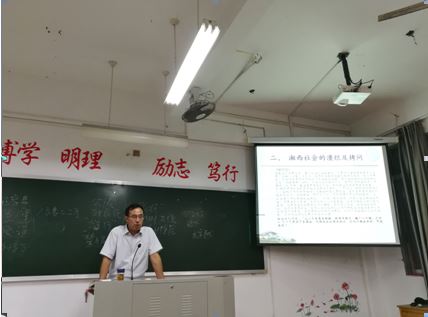 讲座伊始,王烨教授首先向大家讲述了《湘行散记》的写作背景和写作原因,指出了《湘行散记》与《边城》的写作是几乎同时进行的,但是两者一写实、一浪漫,长期以来,学者们对《湘行散记》研究的边缘化,使得人们忽视了沈浪漫文学家身份之外的写实文学作家的形象。随后,王教授用沈和凌宇对《湘行散记》的评价作引子,带我们初步感受书中作品“乡土抒情诗”的气氛,触碰作者在那淡淡的孤独悲哀下隐藏的“悲悯感”。紧接着,王教授结合具体的作品分析,从四个方面阐述了《湘行散记》的“乡土”忧愁,高度赞赏了沈在乱世之中敢于直言不讳讽刺当局的勇气和社会担当精神。此外,王教授归纳了《湘行散记》的三个特点,指出了其写作的政治性、思想的深邃性、作品的艺术性。在王教授的讲授结束后,胡明贵教授总结了讲座的内容,并呼吁在场的同学体会王教授讲课的用心,认真学习王教授读书治学的方法。