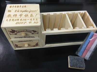 团委主办、16级师本3班承办的“敬谢师恩”感恩教师活动与9月10日开展。同学们集思广益、别出心裁,精心准备一份多功能迷你笔筒,向学院老师致以节日问候和诚挚敬意。多功能笔筒主体部分由一个文具收纳筐和两层收纳抽屉构成,面上有一层小黑板,并附有迷你黑板擦和粉笔,象征着三尺讲台。