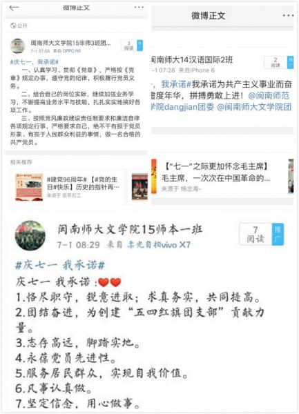 14级师本1班党员率先发声:“庆七一,我承诺:不忘初心跟党走,做合格党员,内化于心,外化于行。”15级汉语国际班预备党员承诺:“庆七一,我承诺:为共产主义事业而奋斗,不虚度年华,拼搏勇敢上进!”“庆七一,我承诺”活动在学院内中营造了喜庆、上进的庆祝党的生日的氛围,通过宣传党的先进性让新老党员同志坚定入党信念,唤醒先进意识,增强党性意识,激励党员同志积极践行入党誓词,以更加饱满的热情发挥共产党员的先锋模范作用。