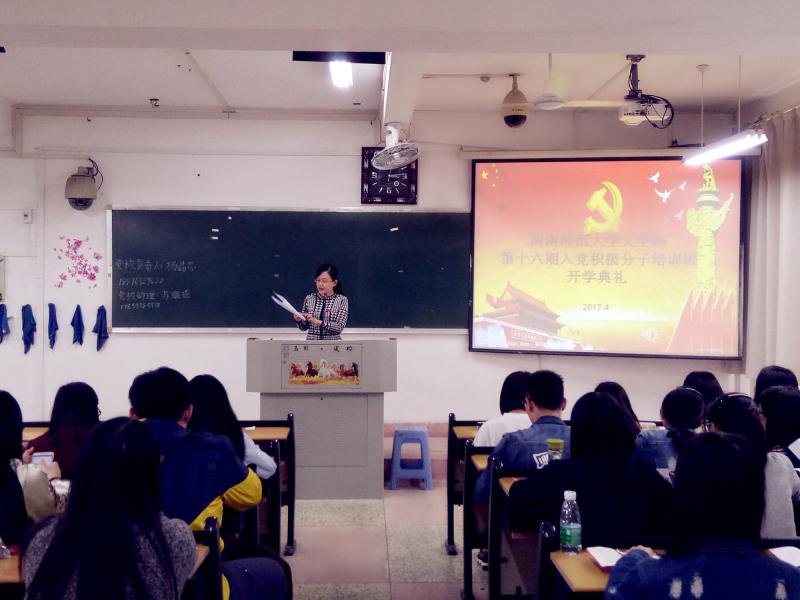 开班典礼在庄严肃穆的国歌声中正式开幕。首先发言的是赵丽霞书记,她围绕习近平总书记的“不忘初心,继续前进”的主题,展开说明中共党员应将理论运用于实践中,要有主体意识,联系广大群众,发挥党员带头作用。其次,党校领队廖利明老师上台宣读第十六期党校成员名单。紧接着,由党校领队张雅娟老师宣读党校学员管理规定。开班结尾,党委老师们对在场的51名入党积极分子表达了党组织的期冀及期望51名入党积极分子在今后的生活中,都要以向上的面貌,乐享生活,服务大众。