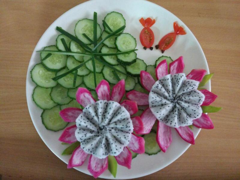 大赛分现场制作、作品解说及作品评比三个流程进行。比赛不乏佳作:4号作品《曲院风荷》,受旅行与荷结缘的启发,以火龙果为食材雕刻出“出淤泥而不染,濯清涟而不妖”的莲花,刀工精细匀称,令人啧啧称好;3号作品《水果圣诞塔》,以圣诞树为原型,胡萝卜为树干,苹果为树根,各色切片水果为树叶,色泽鲜亮,营养丰富。经过激烈角逐,“曲院风荷”荣获一等奖。