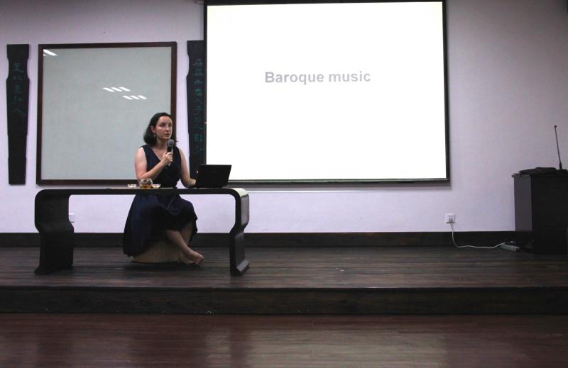 首先,她向我们介绍了繁多的,具有鲜明时代特色的巴洛克风格乐器,并与我们共同欣赏歌剧选段,这样视听结合的方式,加深了我们对17世纪欧洲歌剧理解。17世纪的巴洛克时期是欧洲历史上最惊心动魄、最为活跃的时期,音乐逐步脱离了宗教的束缚,独立性的世俗音乐得到快速发展。因此,这一时期的思想文化艺术充满了蓬勃的生机,涌现出的作品令人目不暇接。顺应时代的潮流和人文主义艺术理想发展的要求,一种将古希腊的戏剧表现手法和世俗音乐融合的新的声乐体裁――歌剧在意大利诞生了,而《达芙尼》正是其诞生的标志。欧洲歌剧诞生、发展、高潮、二次巅峰……跌宕起伏的 发展历程在德玛丽女士的娓娓道来下,脉络清晰地出现在我们的脑海里。现场师生认真聆听,笔记,时不时响起热烈的掌声。