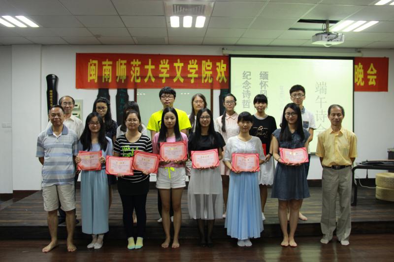 诗歌朗诵结束后,进入“2016闽南诗歌节征文”获奖作品颁奖环节,由青禾先生、杨西北主席、黄金明院长分别为获一、二、三等奖的作者颁发荣誉证书,黄金明院长特别表达了对获奖同学的祝贺,同时也鼓励大家积极写作,坚持写作。随后黄金明院长、王朝华教授与既明文学社前任社长蒋德烽,现任社长张文惠一起合影留念,宣布既明文学社正式成立。最后王朝华教授为诗会做了总结,他说道:“山不在高,有仙则灵,人不在多,重在有精彩的氛围,但愿诗歌能带给我们心灵更多的光辉。”