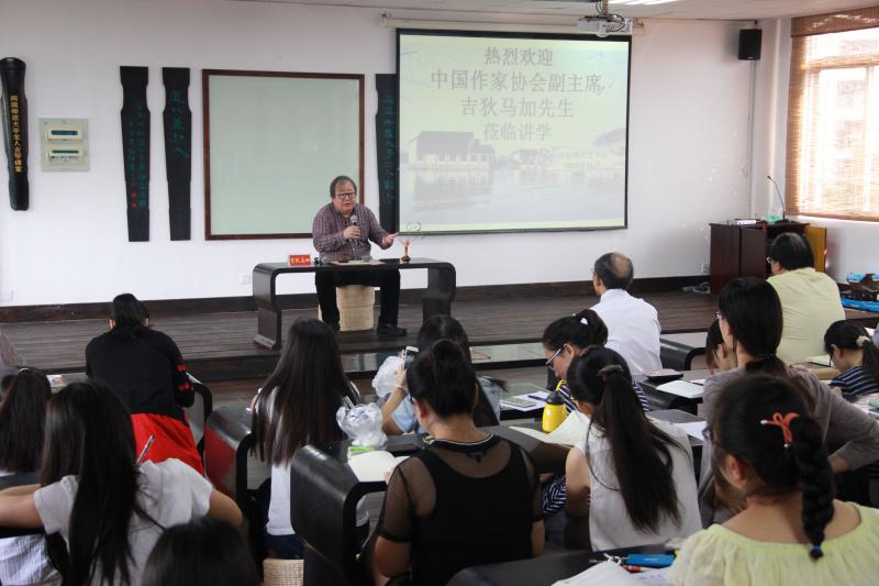 院长吉狄马加应邀在博东406为我校师生讲学。校党委书记林晓峰、福建省文联副主席陈毅达及天使动漫