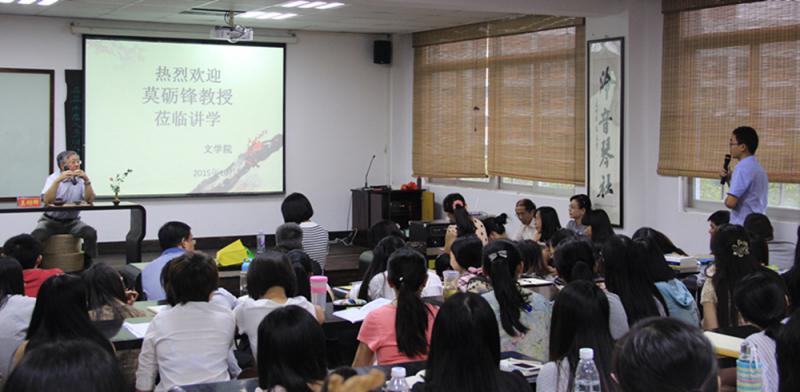 研究生传授了古典诗歌的研究方法,他首先强调,研究的最基本前提就是研究的文本必须真实可靠,必须对阅读对象进行文献学角度的审视,他认为找材料不但要仔细、全面,还要学会甄别文献的真假。其次,他强调要回归文本的阅读与深究,不做“外围”的观望,下苦工熟读背诵;阅读文本,要对文本及其隐藏价值进行深入发掘、研究。最后,他还以中西方研究理论差异为例,告诫学生不要为走“学术捷径”而过度依赖新方法,放弃传统的治学基本功。莫教授生动形象的表述、幽默风趣的语言赢得了在场听众的阵阵掌声。