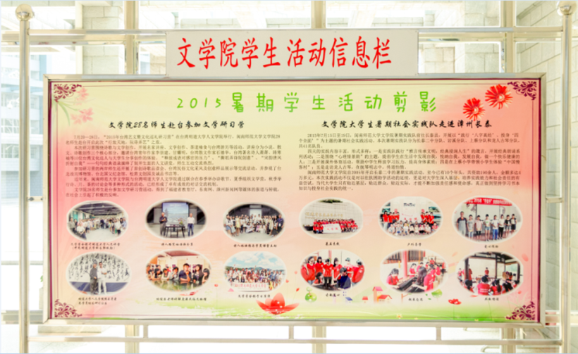 重视环境育人的功能,学院领导及政工干部多次深入教学楼和学生宿舍,对教学设备、宣传版面设计、宿舍硬件设施及卫生进行了视察,现场办公,着力解决。《2015暑期社会实践活动剪影》、《对外交流教学活动剪影》、《天使动漫