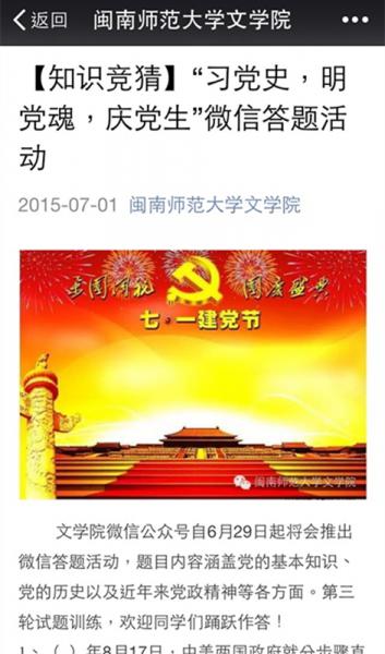 微信公众号推出微信答题活动,题目内容涵盖党的基本知识、党的历史以及近年来党政精神等各方面,当天点赞以及阅读量均超过70人次;此外,天使动漫