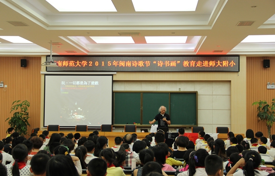 2015年闽南诗歌节之“诗书画”拓展活动走进师大附小与漳州一中,此次活动邀请了台湾著名诗人林焕彰先生与萧萧先生。林焕彰先生以“玩文字、玩心情、玩写诗、玩创意”为主题,与附小的同学们进行了充满诗趣与乐趣的互动;萧萧先生则以“奇诗欣赏与创作”为主题,为漳州一中的学子带来了一场别开生面的演讲;