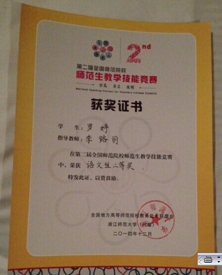 2011级汉语言文学教育专业罗婷同学斩获了语文组全国二等奖。