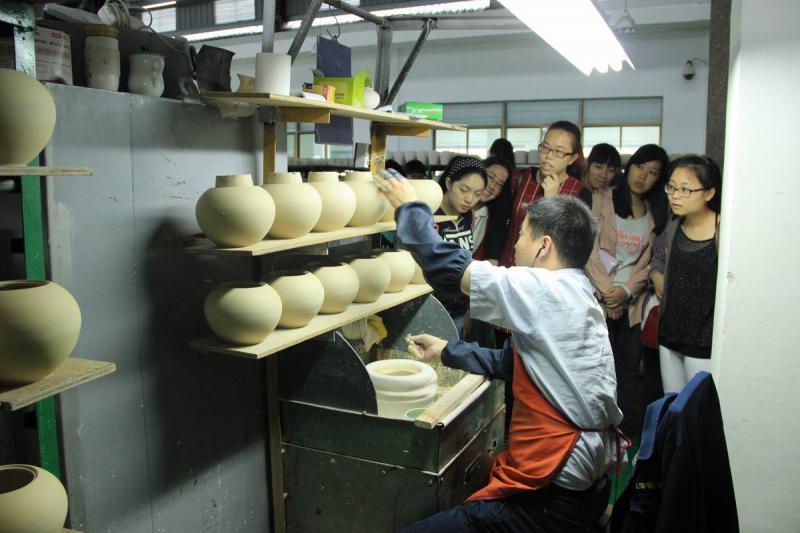 将制陶、茶艺等实训环节引入2011级非师学生的实习培养。围绕着培训内容、教师授课和住宿等问题双方进行协商并达成共识,期望以此合作为契机为两校互通有无、资源共享搭建桥梁与平台。随后,58名实习生进行为期两天的户外教学实践活动,从制坯车间走到陶瓷制作工坊再回到天福窑的历史展览区,在体验式教学中学习制陶和制茶工艺技能知识。