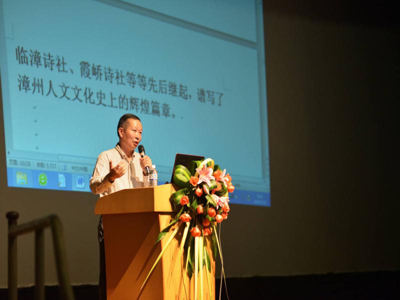 在讲座上,施榆生副教授首先提出闽南文化是中华文化中的一种具有鲜明特色的地域文化,并简单介绍了闽南文化在闽南地区的发展,从唐代的“开漳圣王”陈元光谈到宋代的朱熹、再谈到元明清时期的“玄元诗社”、“南屏诗社”,为在场的观众展现了一条清晰的闽南文化发展脉络。接着,从语言学的角度讲解了被誉为“古汉语活化石”的闽南话具有一套庞大而严整的文白异读系统,体现出闽南话文雅与土白的不同风格。在讲座接近尾声时,施教授还与现场观众进行互动,带领大家用闽南语吟诵了多篇经典作品,获得了阵阵热烈的掌声。