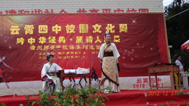 中文系芝山剧社联合院芗涛剧社,携手各系校园戏剧明星,为云霄四中的师生带来了精彩的演出,共有中学课本朗诵《沁园春·雪》、《雷电颂》、《水调歌头》,课本剧《乌台苏话》、《少年心事》,校园小品《沙枣树》,经典诗词诵读《忆秦娥·娄山关》、《七律·人民解放军占领南京》、《行路难》(其一)等节目,更有中文系芝山剧社品牌节目——由史硕婷同学带来的快板《国泰民安享太平》(选自话剧《龙须沟》)。
