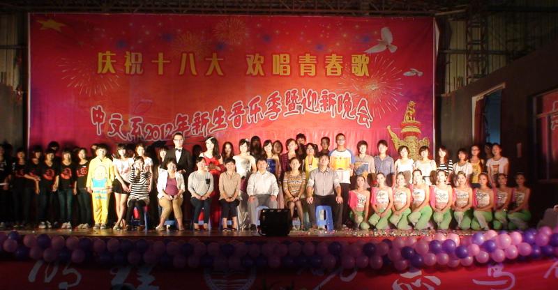 庆祝十八大,欢唱青春歌。11月16日晚19时30分,由中文系团委主办,中文系艺术团承办的新生音乐季暨迎新晚会于球类馆隆重举行。院党委组织部周霖老师,艺术系方芳老师、我系党总支副书记赵丽霞老师等莅临本场晚会,并担任本次新生红歌赛的评委。