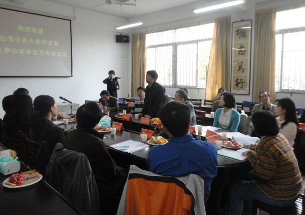 首先在中文系会议室举办欢迎仪式,胡金望主任对台湾中央大学中文系师生参访团表示热烈欢迎,并向参访团简述我系概况。杨祖汉教授向我系介绍台湾大学中文系的师资力量和办学经验,并就此提出相互交流建议。我系和台湾中央大学中文系互赠书籍,并合影留念。