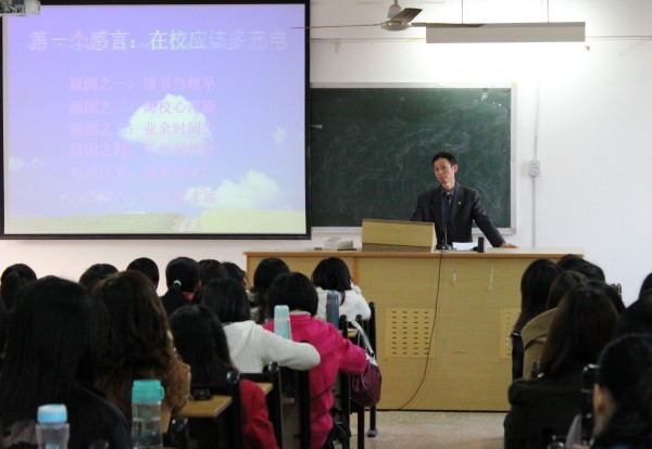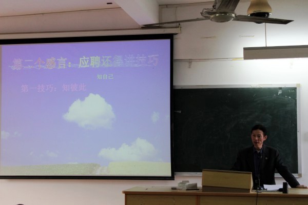 余老师长期参与教师招考的招聘活动,对学生参加教师招考的技巧有自己独到的见解,受到校内同学们的欢迎。首先,他以“让你在就业上少走弯路”为主题,与同学交流了他多年工作的感言。他认为“在校应该多充电,应聘还得讲技巧,求教必须求实效”;接着,余老师详细地介绍了充电的六大原因、应聘的三个技巧以及三项实效;最后,本次讲座在他对高考真题的深入解析中顺利结束。