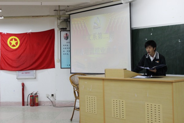 在激情昂扬的团歌过后,主持人吴梦婕宣布优秀小组和优秀学员的名单,陈文婷老师为获奖者颁发了奖状。接着,来自10级中本一班的学员代表刘泽燊上台发言。他对授课老师表达衷心的感谢,并表示此次培训让他受益匪浅。至此,为期一个月的团校培训圆满结束。