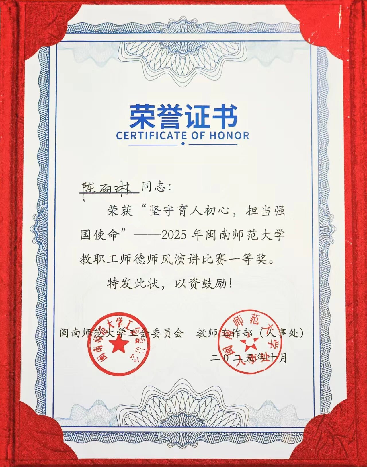 陈丽琳老师凭借真挚饱满的情感、深刻独到的思考与流畅生动的表达,在众多优秀参赛者中崭露头角,最终以全校第一名的优异成绩斩获一等奖,为学院赢得了荣誉。