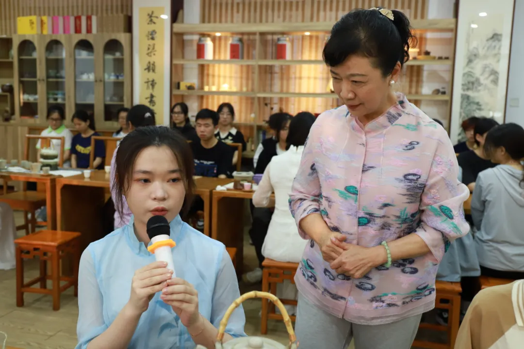 紧接着,李阿利老师对泡茶和喝茶的规矩以及如何鼓掌以表达敬意进行讲解。她归纳学茶的过程中有四个重要的点:一是周全地备好茶具,二是专注地泡茶,三是虔诚地奉茶,四是欢喜地喝茶。讲解完毕,学生们在老师的指导下依次调整了坐姿、表情和喝茶、鼓掌的方式,加深了对茶文化的了解与体验。