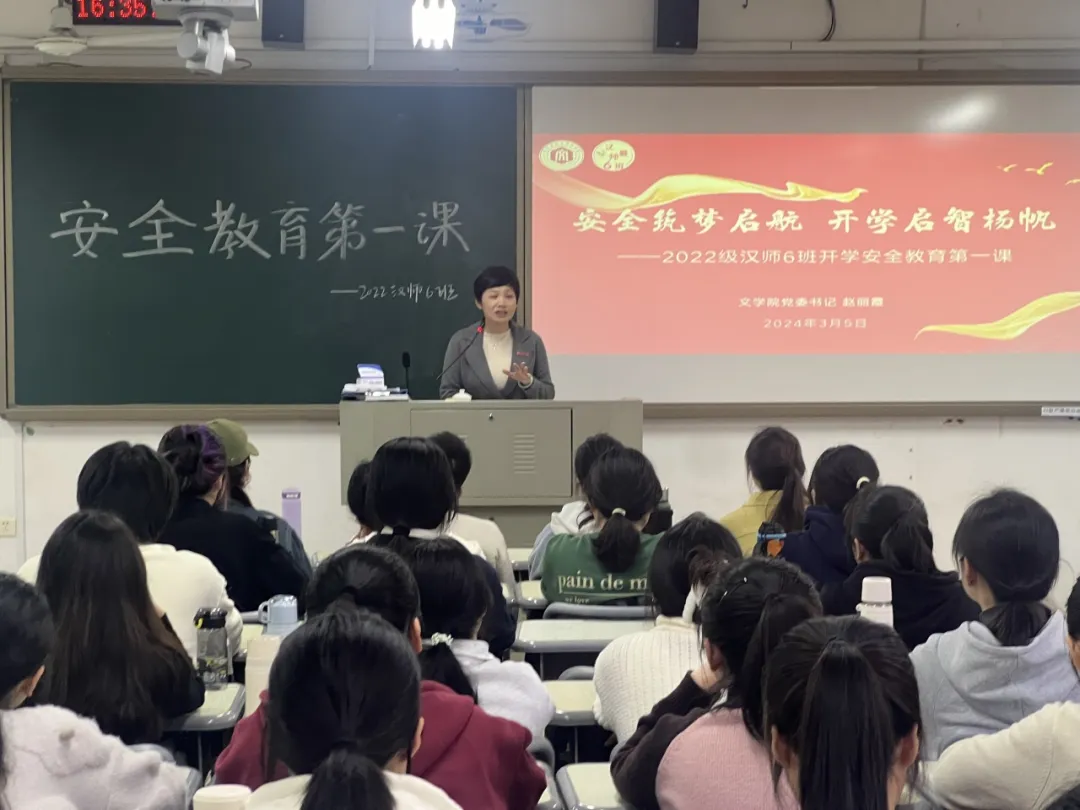 党委书记赵丽霞、党委副书记林晓与对接联系的2022级汉语言文学(师范)6班和2022级汉语言文学(师范)1班共同上好开学安全教育第一课,深入了解学生学习、生活等方面情况,提醒学生提高安全防范意识,定期对宿舍安全进行细致检查和排查,从我做起,从小事做起,杜绝安全隐患。