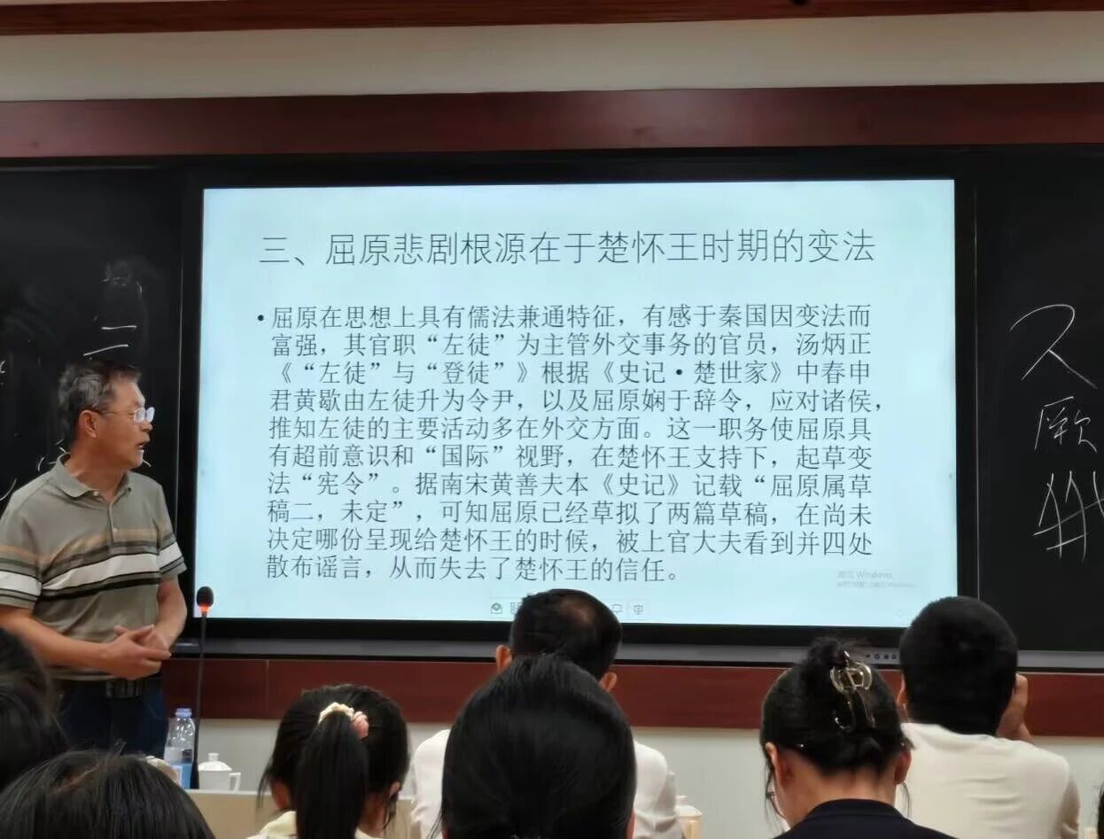 最后,张树国指出屈原一生的悲剧命运来源于其青年时代在楚怀王时期的变法。屈原的思想儒法兼通,主管外交事务的“左徙”官职又使其具备超前意识和“国际”视野。他虽出身贵族却力主改革楚国世卿世禄的弊政,因此得罪了楚国群小,被踢出贵族群体。张树国还指出,其变法草案虽未公诸于世,但《离骚》《九章》中的“彭咸之遗则”“彭咸之造思”充分反映了“彭咸”与变法之间的关系;他的变法因触及贵族的根本利益而使其短暂的政治生涯充满了悲剧性。