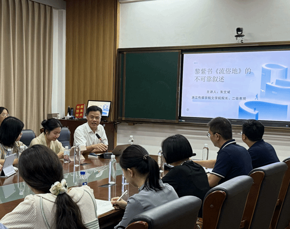 讲座中,朱文斌以修辞学派理论为框架,系统拆解了《流俗地》文本中不可靠叙述的具体类型与动态演变逻辑。他结合小说中盲人银霞的视角、多人物叙事的切换等关键情节,详细分析了不可靠叙述的生成机制——既源于叙述者的认知局限与主观情感倾向,也受制于故事所处的多元文化语境与历史背景。随后,他进一步引入认知性研究方法,将讨论从文本创作层面转向读者接受层面,深入探究读者如何通过文本细节考证、语境还原,实现不可靠叙述向可靠叙述的转化,这一过程如何影响读者对故事内核的理解,为在场师生提供了全新的文学解读思路。