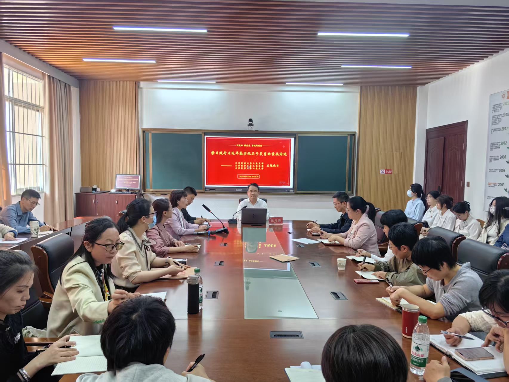 在党课上,张龙海紧扣学校美育工作主题,结合我校工作实际,围绕“美育的价值意义”和“美育的实施路径”两个主要问题与全体党员展开交流。关于美育的意义,他指出美不仅是纯洁道德、丰富精神的关键源泉,更是审美、情操与心灵教育的综合体现,高校应致力于培养情操高尚、文化底蕴深厚且具备社会责任感的人才。紧接着,他阐述了美育实施的重点,包括立德树人、扎根时代生活、遵循美育特点及弘扬中华美育精神,并列举了我校在课程建设、载体创新、价值引领及生态塑造等方面的美育工作的具体实践和显著成果。