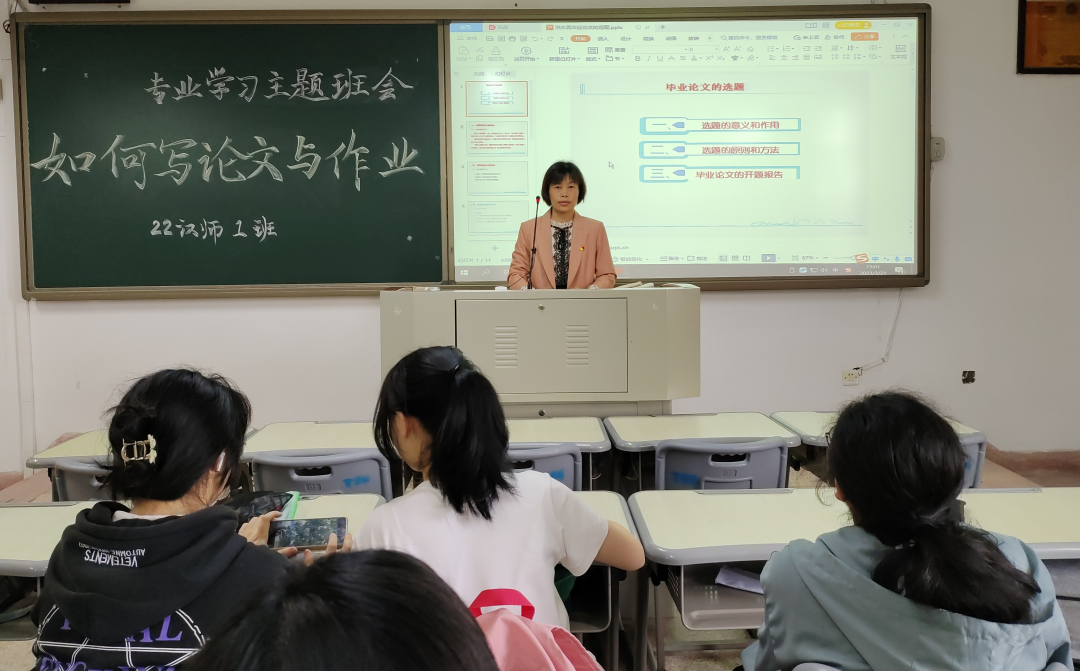 22级汉师1班于博东405举行“如何写论文和作业”专业学习主题班会,班主任讲解毕业论文选题与日常作业写作。