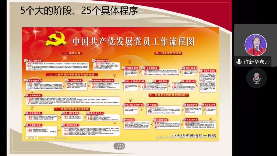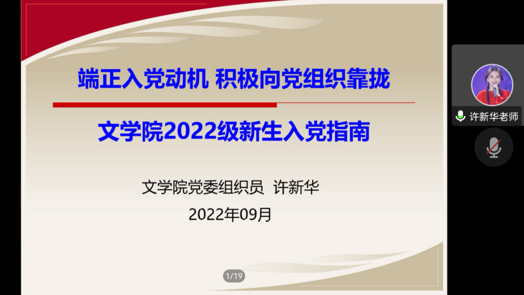党委组织员许新华老师为22级新生做入党指南宣讲。本次的宣讲主题是“端正入党动机 积极向党组织靠拢”。许新华老师首先对中国共产党的性质、宗旨,党员的权利、义务以及党的最新理论成果习近平新时代中国特色社会主义思想进行简要介绍。许新华老师从“发展党员的政治标准”和“入党程序”两个方面做详细解读。发展党员把政治标准放在首位,大学生要端正入党动机,树立共产主义信念,践行全心全意为人民服务的宗旨,认真学习习近平新时代中国特色社会主义思想,争取早日在组织上、思想上入党。许新华老师详细介绍了入党的5个阶段、25个具体程序,强调入党具有严格的程序,每一个流程都会考察申请人在思想、政治、学习、工作、生活等各方面的表现。最后,许新华老师详细讲解如何写好入党申请书,并对与会学生的入党问题进行解答。本次宣讲对加强新生对党的认识、吸引优秀学生积极向党组织靠拢具有重要意义。