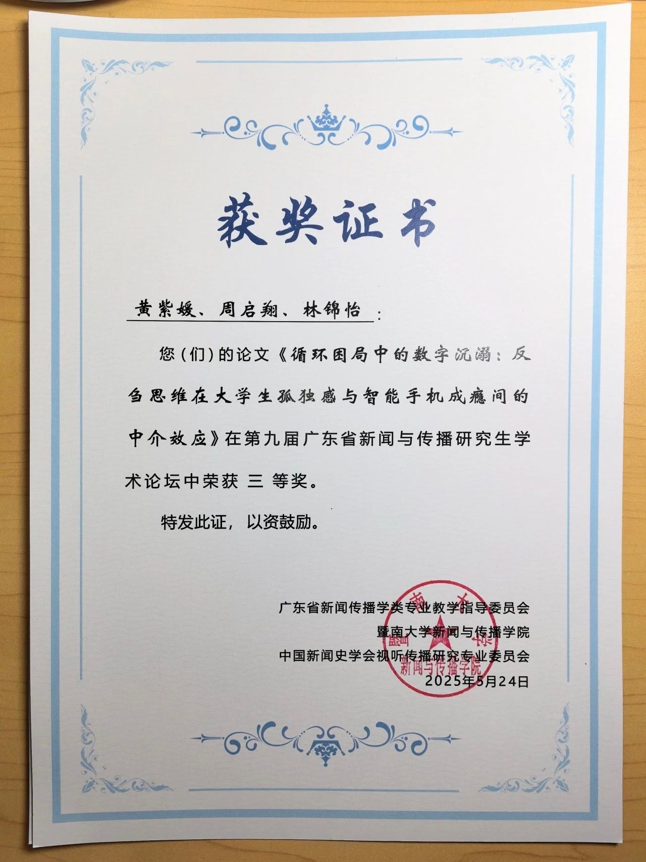 2022级卓越教师人才实验班成员周启翔、黄紫媛、林锦怡的两组实证研究脱颖而出——论文《群体压力下的数字溺水者:孤独感和焦虑在大学生同伴压力与智能手机成瘾间的中介效应》《循环困局中的数字沉溺:反刍思维在大学生孤独感与智能手机成瘾间的中介效应》,分别从“同伴压力-情绪传导-成瘾机制”与“反刍思维-孤独感知-行为依赖”双路径切入,以量化模型揭示数字时代大学生心理与行为互动规律。