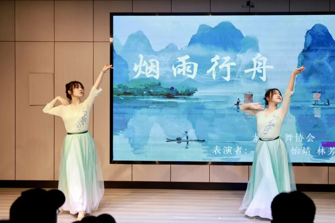 行至江南,烟雨萦纡,龙江飞舞协会带来的舞蹈《烟雨行舟》舞姿轻盈,尽显春意盎然,勃勃生机。