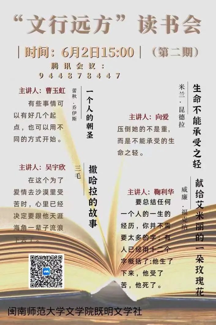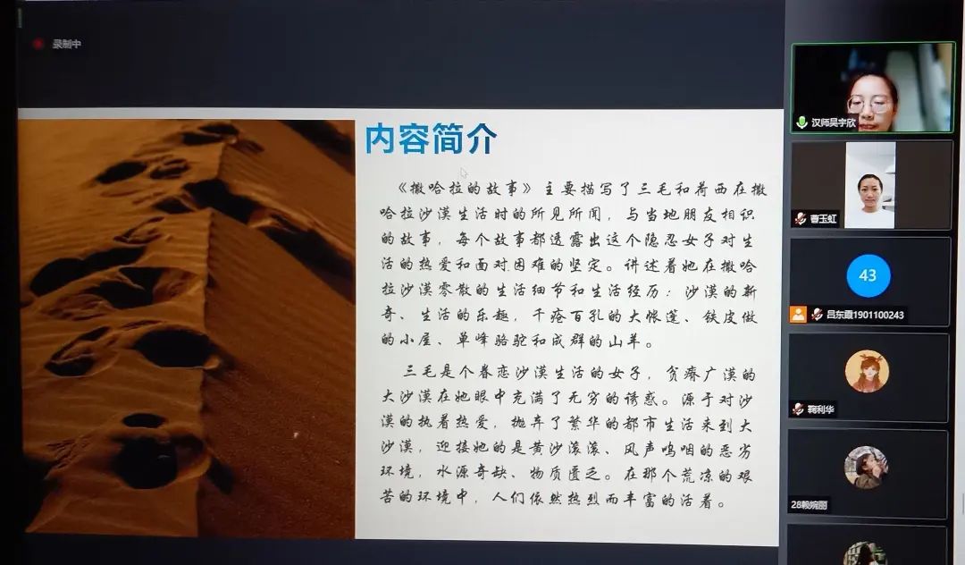 既明文学社在5月12日下午、6月2日下午分别开展了两场读书交流会,12位讲书人采取线上腾讯会议的方式分享书籍。同学们从文本分析出发并结合个人对书籍的理解,来交流阅读体会。