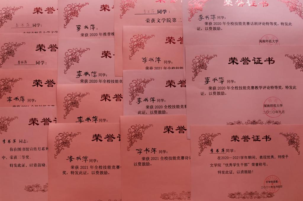 博文报编辑部部长,入学以来获2020-2021学年国家奖学金、专业一等奖学金、三好生标兵、校优秀共青团员、院优秀学生干部、军训宣传优秀组织者。第二课堂方面获第四届福建省大学生书评大赛二等奖、“两赛”经典诵读特等奖、“两赛”李林剧评特等奖、“两赛”教学评论特等奖等多项荣誉,另有专业论文收录于省级期刊《名作欣赏》,多篇文艺稿收录于《芗草》《博文报(文艺稿)》《它山》《中华经典诗词诵读课程教学活动汇编》。