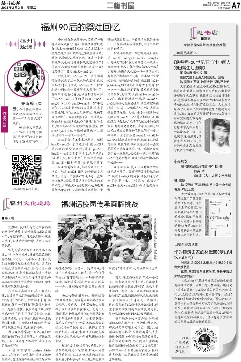 齐昕筠,2018级汉语言文学(师范)2班,曾获2019年国家奖学金、《江苏少年文艺》2020年度佳作奖、校专业一等奖学金,多次于省级报纸刊物发表小说、散文。现为福州真鸟囝方言保育组织志愿者、《福州晚报》“福州腔调”专栏作者。