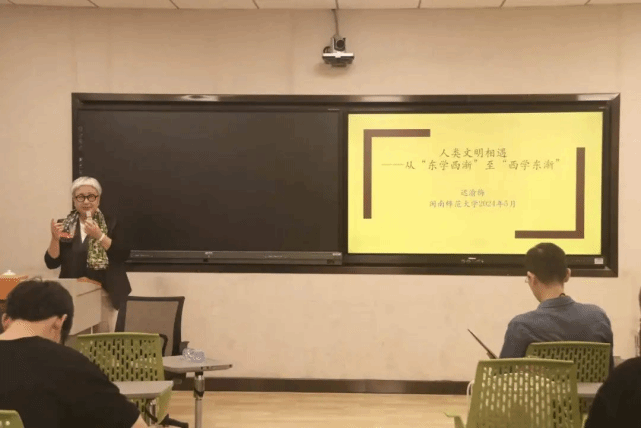 随后,迟渝梅就东学西渐和西学东渐两方面展开论说。在介绍第一条主线东学西渐时,迟渝梅列举了诸多在华欧洲传教士的信札,这些信札分为两个阶段,第一阶段为17世纪至20世纪中叶的游记,第二阶段为以儒家思想和宫廷政治生活为中心的信札。同时,迟渝梅点出21世纪的中国与欧洲、中国与中东的交流的背景,并介绍了闽南地区与阿拉伯帝国之间的海上丝绸之路这一重要桥梁。在第二条主线西学东渐方面,迟渝梅首先提到利玛窦和徐光启这两位人物,并采用对比的方法将东学西渐与西学东渐进行比较,从而点出二者并非断崖式改变,而是交融与暗流涌动的事态。