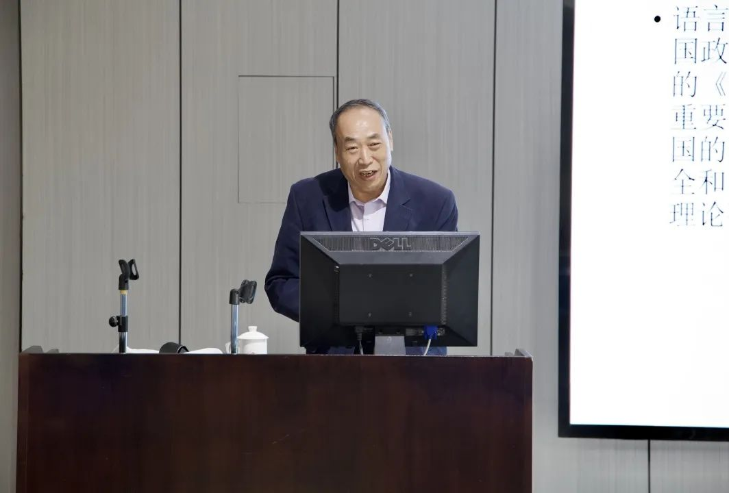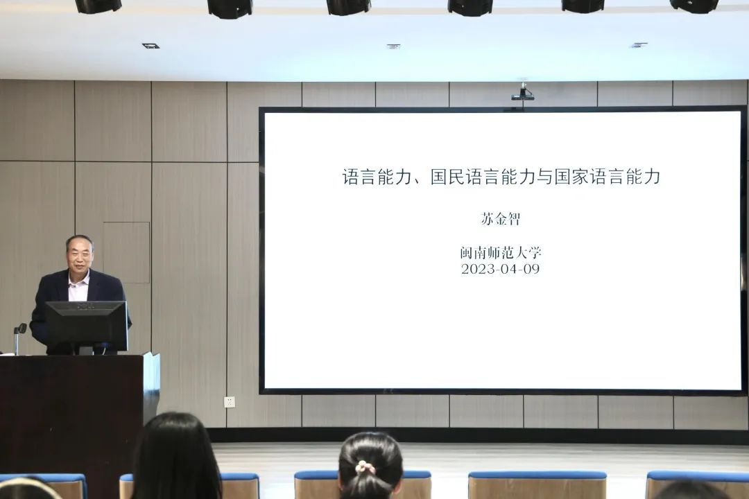 讲座开始,苏金智以现实角度为出发点,引出“什么是语言能力、语言能力的重要性、国民语言能力与国家语言能力”。他表示我们所说的语言能力指的是人们运用语言进行交际或完成一定任务的能力,可以从不同方面进行划分。发生方式、学习使用角度、主体数量都可以作为划分依据。苏金智强调,作为师范类院校的师范生,语言能力尤其是国民语言能力更为重要。目前,世界主要国家的语言使用主要以英语为官方语言,英语在全球各个领域占领了霸权地位,汉语要想赶超英语,未来的语文教育者任重而道远。他指出,国民语言能力是国家语言能力的重要组成部分,国家语言能力在国民语言能力之中,又在国民语言能力之上,国民语言能力与国家语言能力存在着互相转化、互相影响的关系。国家语言能力主要由个体语言能力、政府部门语言能力与国家管理语言能力三个部分组成。苏金智点明语言能力、国家语言能力和国民语言能力三者关系,并用生动的例子,讲述了学生贮备丰富语言能力的重要性——为国家服务,推动历史发展。