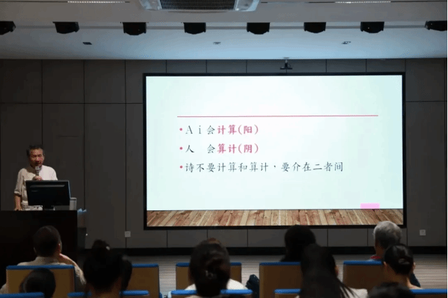 白灵首先介绍了自己所编书籍《新诗跨领域现象》,指出诗可以与绘画、建筑、电影等结合,诗的可能性是无穷的。随着时代的变革,创作者应将诗歌与科学有机结合。白灵通过讲述他将自己所作诗歌与AI绘图结合的经历,提出AI是美的“救火队”与“合伙人”。同时,他也提醒同学们AI写作仍有其局限性,人的想法是AI远不能匹及的。在随后的提问环节中,他就“AI写作所需设备”、“后续版权”等问题与同学们展开探讨。