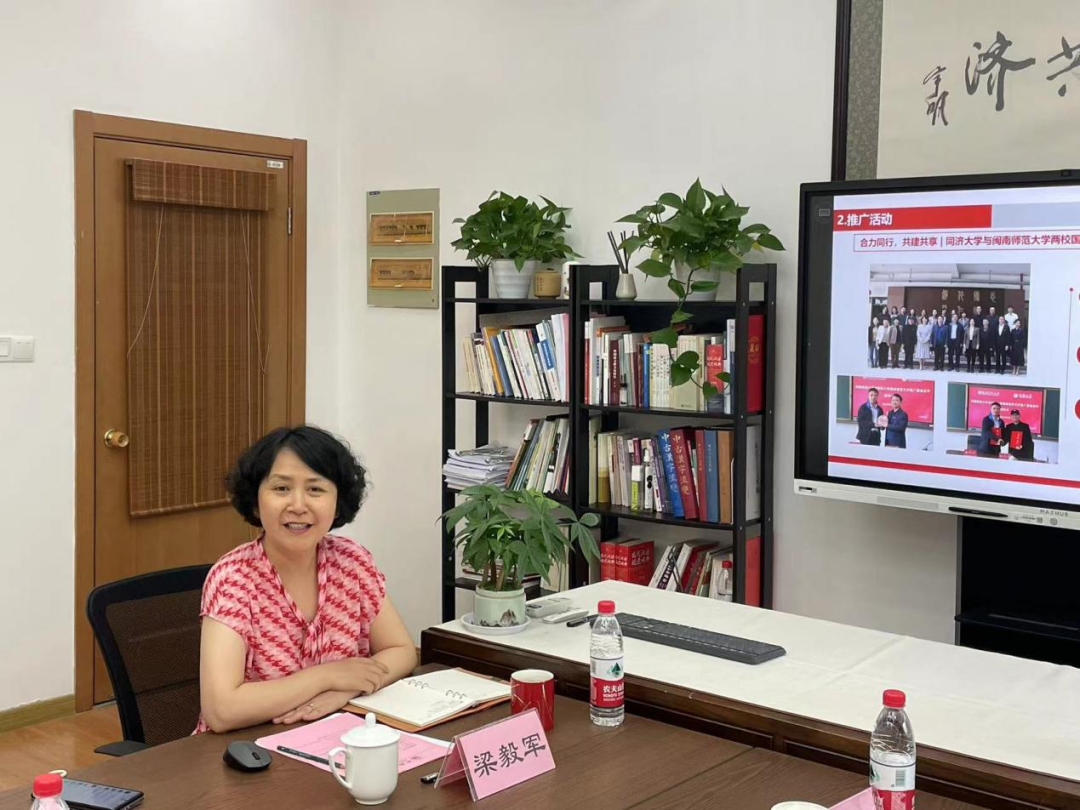 张龙海副校长和孙宜学院长分别介绍了两校基地概况和建设情况。梁毅军副院长则从基础保障、工作情况、经验成效、近期活动等四个层面详细讲述了同济基地的相关情况,并展示了“熊猫叨叨行走看中国故事班”“上海外国人诗词大会”“留学生中国生态文明体验项目”等国交院特色项目。