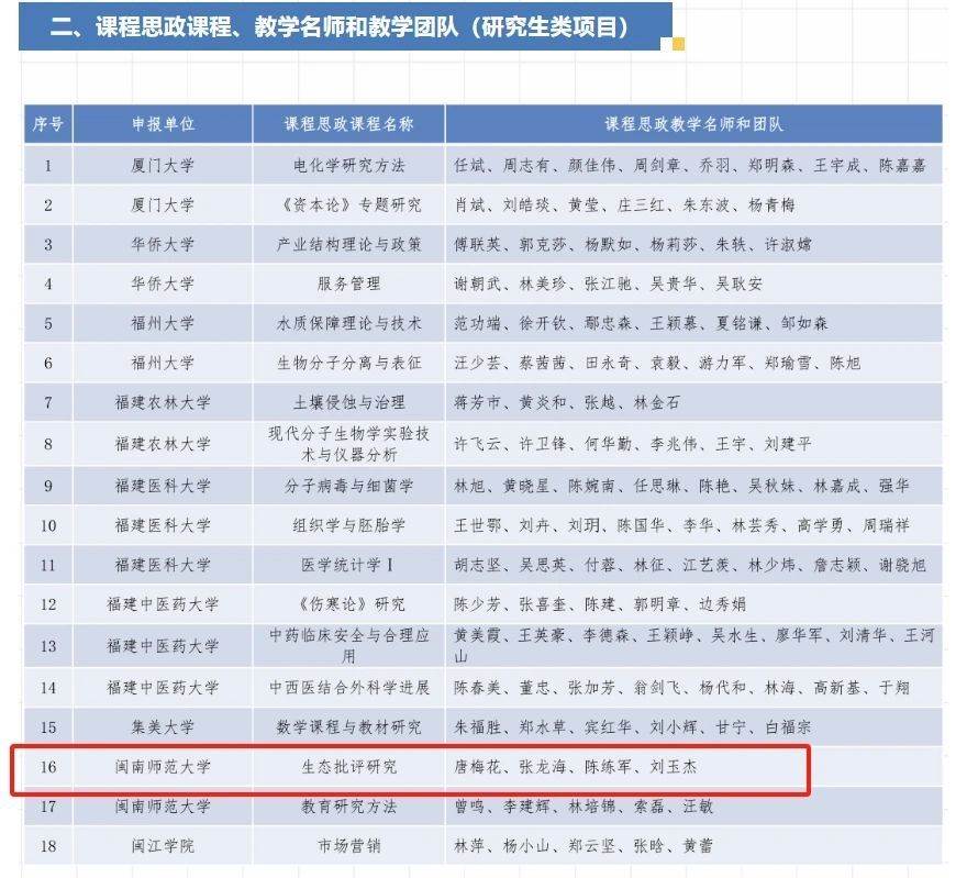 近日,省教育厅公布了2024年课程思政项目(普通高等教育类)名单,天使动漫 申报的《生态批评研究》成功入选研究生类课程思政课程,唐梅花、张龙海、陈练军、刘玉杰入选课程思政教学名师和团队。